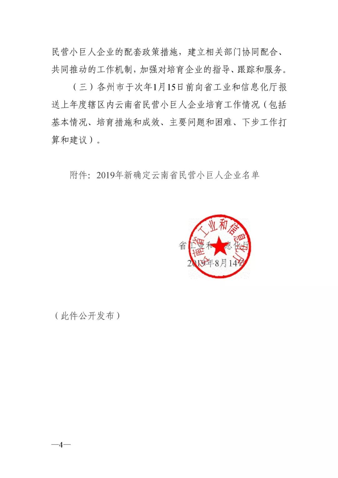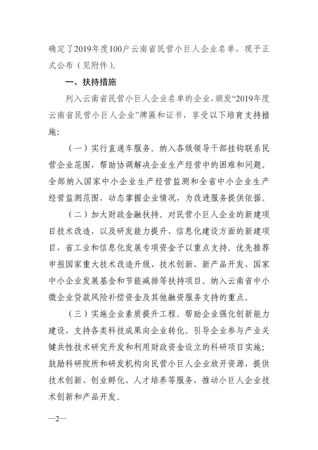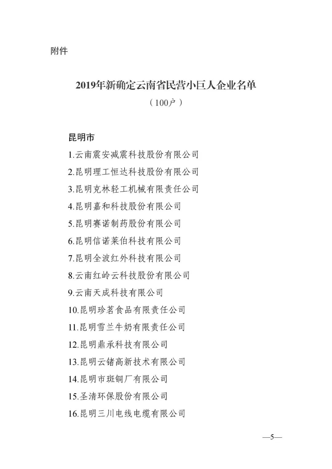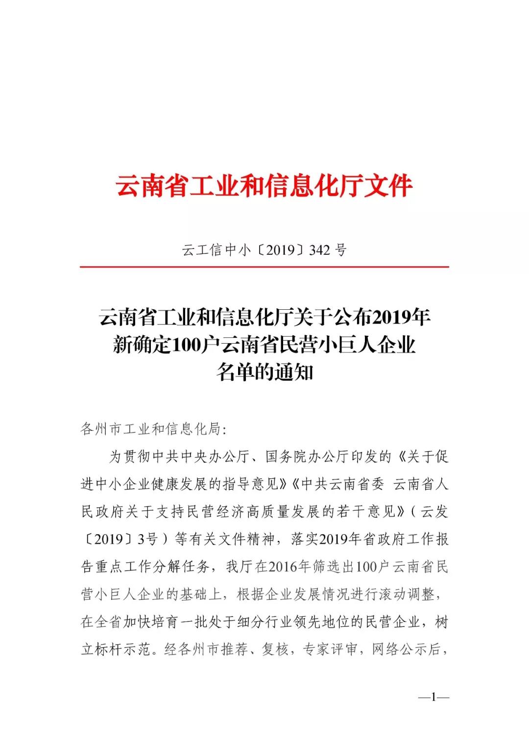 【公示】云南省工业和信息化厅关于公布2019年新确定100户云南省民营小巨人企业名单的通知