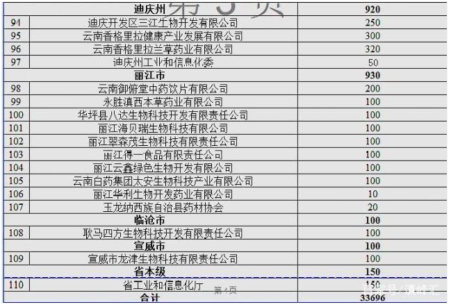 在公布的专项资金安排名单中,共有110个单位和企业享受到了共3.3696亿元的云南中药饮片产业发展专项资金。其中,昆明市获得1.1939亿元资金安排,34家单位获得10-900万元不等的中药饮片产业发展专项资金,是云南资金总额和企业最多的地区;楚雄9家单位共获得专项资金4912万元,文山13家单位共获得3589万元专项资金。名单涉及云南白药、昆药集团、一心堂、康美药业等多家上市公司,专项资金由100万元到超千万元不等。其中,获专项资金单项最高的企业是云南在新三板挂牌的云南大唐汉方制药股份有限公司,获得949万元。该公司是云南普洱的民营股份制制药企业,成立于2000年,目前公司拥有56个药品批准文号,主要品种有龙血竭片、龙血竭含片等。公司称,力争3-5年经新三板过度,实现国内主板上市,实现销售规模10亿元,利润1亿元,税收上亿元的目标,成为国内规模化的知名中药企业。名单中,也有同为新三板挂牌的维和药业、滇草六味、七丹药业等。