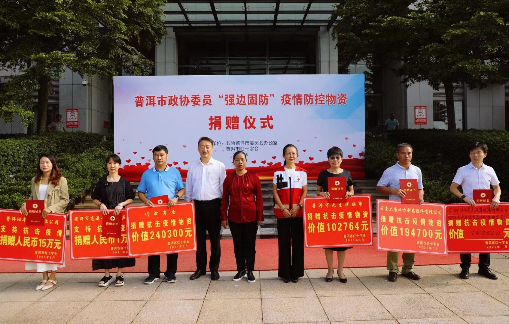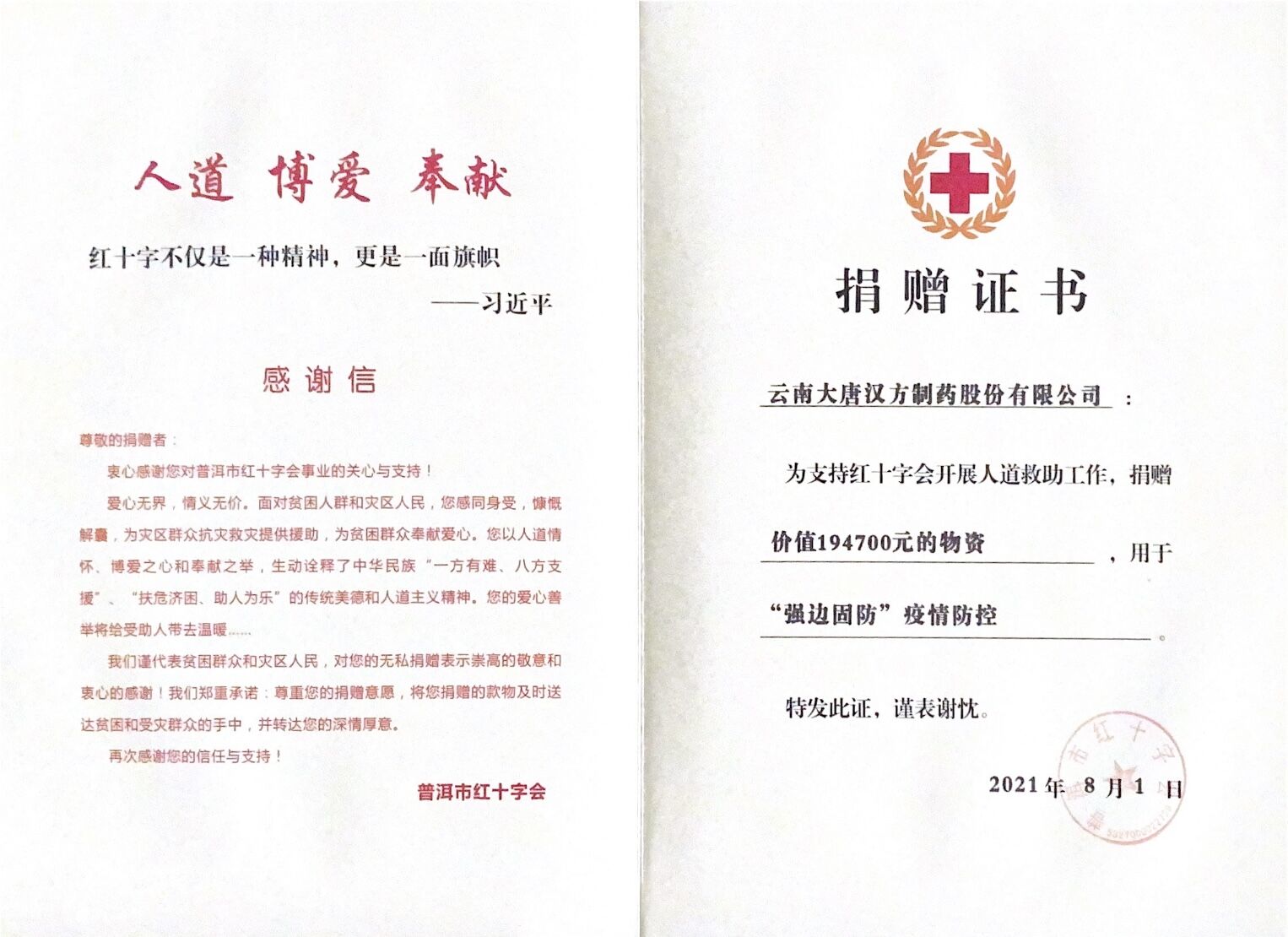 云南大唐汉方制药股份有限公司朱光荣董事长作为政协普洱市第四届委员会常务委员,积极支持普洱市委、市政府、市政协做好疫情联防联控工作。为加强物资供应保障,2021年8月1日,公司通过《普洱市政协委员“强边固防”疫情防控物资》捐赠仪式,向值守边境一线的各级党政干部、医护人员、军警力量等一线防控人员捐赠药食同源的绿色大健康饮品《不染汤》2200件,价值19.47万元,支持一线防控人员更好地坚守国门。