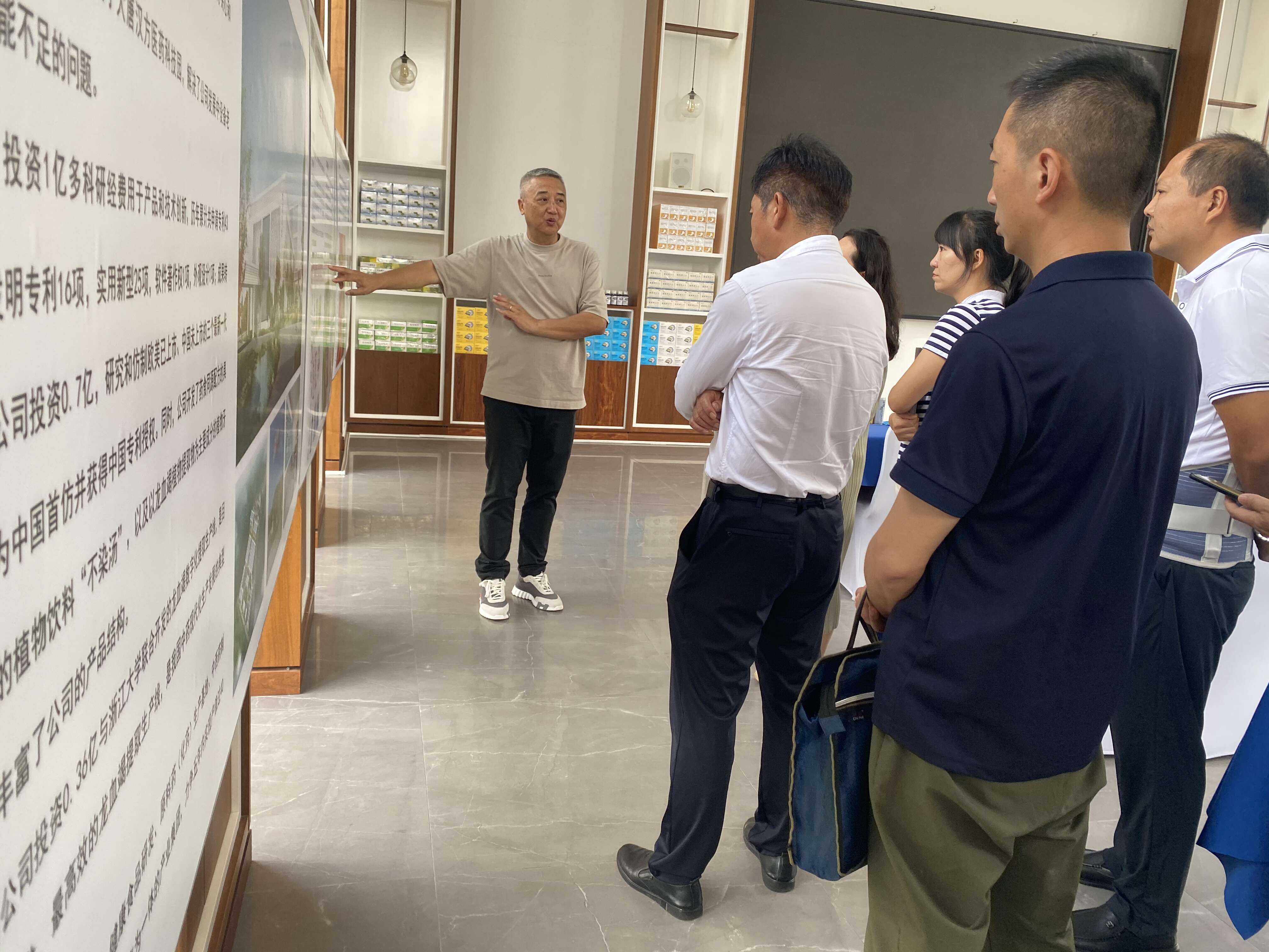 朱光荣董事长在公司展厅向调研组一行汇报了公司总体规划思路及生产经营情况,公司在稳步推进主营业务龙血竭片(肠溶衣)、龙血竭含片、香砂养胃片等药品生产的同时,结合公司自身的技术优势,研发出特色非药产品药食同源的植物饮料“不染汤”、以龙血竭植物提取物为主要成分的植物牙膏和化妆用品。朱光荣董事长特别介绍了公司研究和仿制欧美已上市、中国未上市的三个最新一代儿童感冒用药的研究进展情况,目前氨美素、氨愈素、氨苯素三个产品仿制研究阶段已经基本完成,其中氨苯素的技术转移和工艺移交已经完成并完成申报用三批样品生产,接下来六个月内将完成技术转移、工艺验证及三批样品生产。