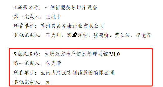 《大唐汉方生产信息管理系统V1.0》普洱市职工创新成果二等奖;