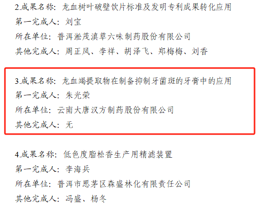 《龙血竭提取物在制备抑制牙菌斑的牙膏中的应用》普洱市职工创新成果三等奖;